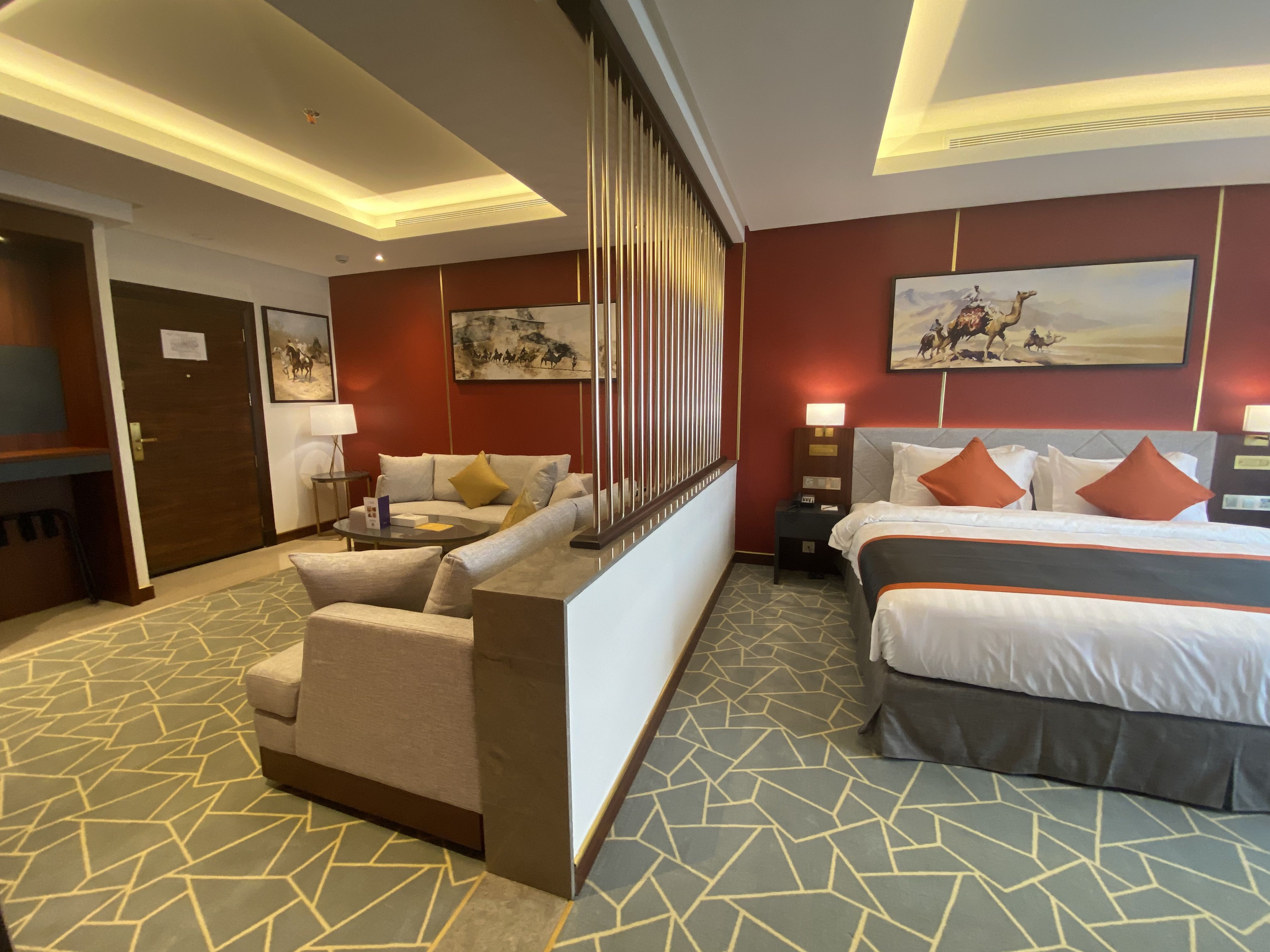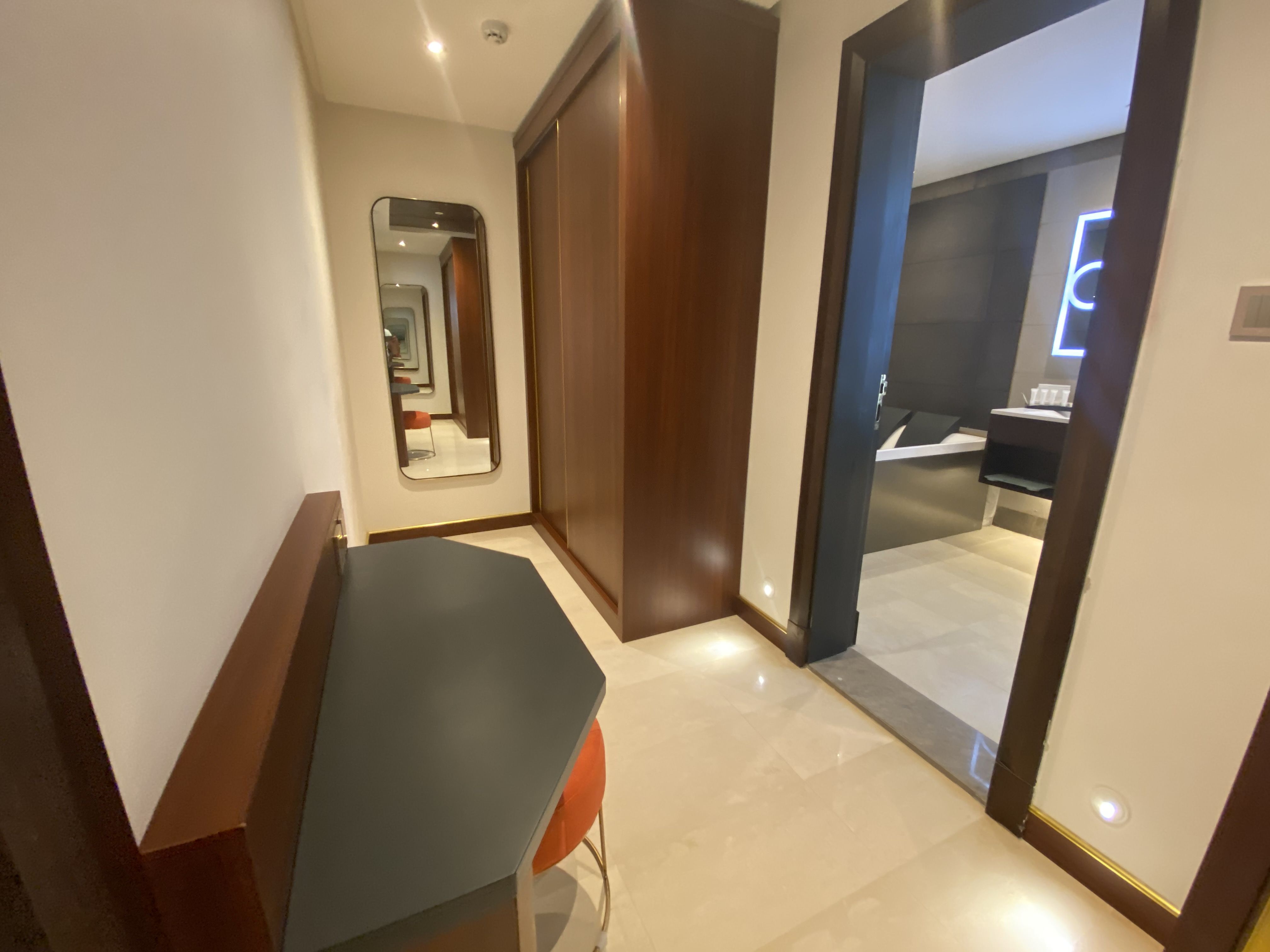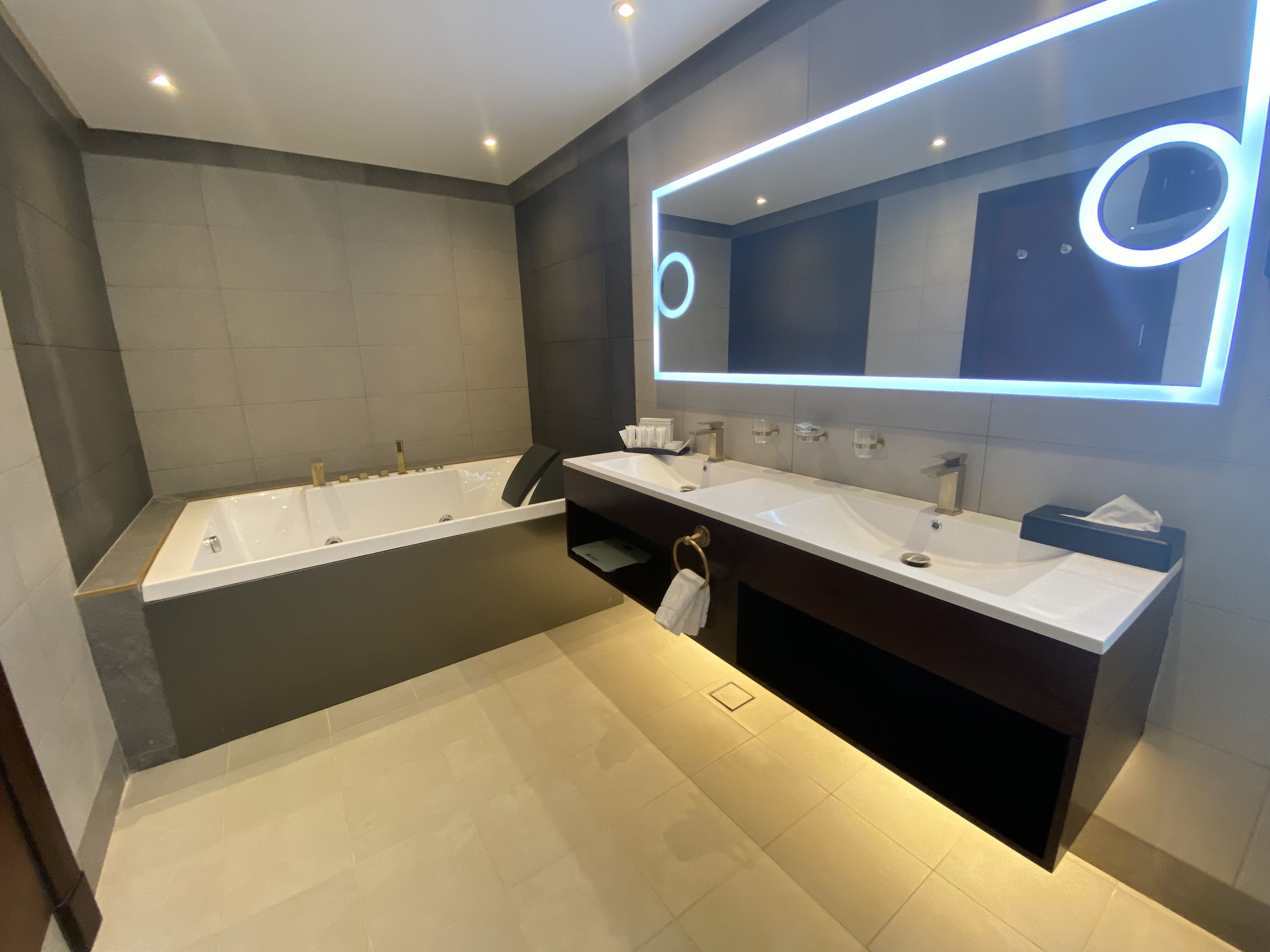 غرفة نوم مريحة مع سرير كبير وغرفة ملابس متصلة بغرفة المعيشة بها أريكة وسرير أريكة، كل غرفة مجهزة بتلفزيون منفصل و حمام الجناح مجهز بجاكوزي وخزانة دش من أجل راحتك.